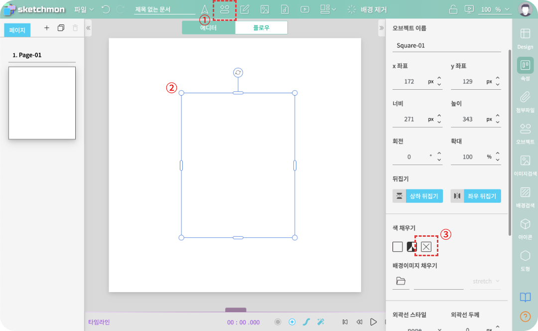 1. 화면에 사각 박스를 적당한 사이즈로 드래그 하여 그리고, 배경을 없애 투명하게 만든다.