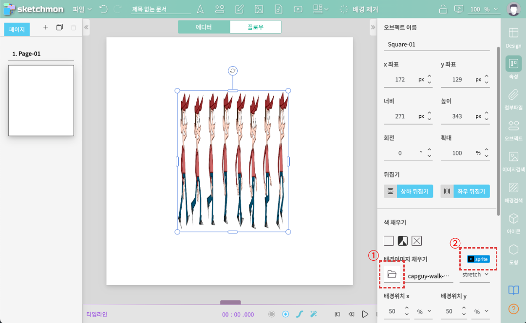 2. 만들어진 사각박스를 선택한 뒤 우측 [배경이미지 채우기] 를 클릭하여 이미지를 선택하면 아래와 같이 사각박스에 이미지가 들어간다. 이미지가 들어가면 우측에 파란색 [sprite] 버튼이 생기는데 그걸 클릭한다.