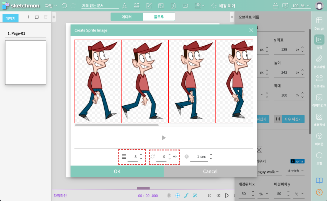3. 스프라이트 생성 화면이 열리면 아래와 같이 8조각으로 나누고, 재생반복 항목은 무한대(∽)아이콘을 누른다. 이후 [확인]