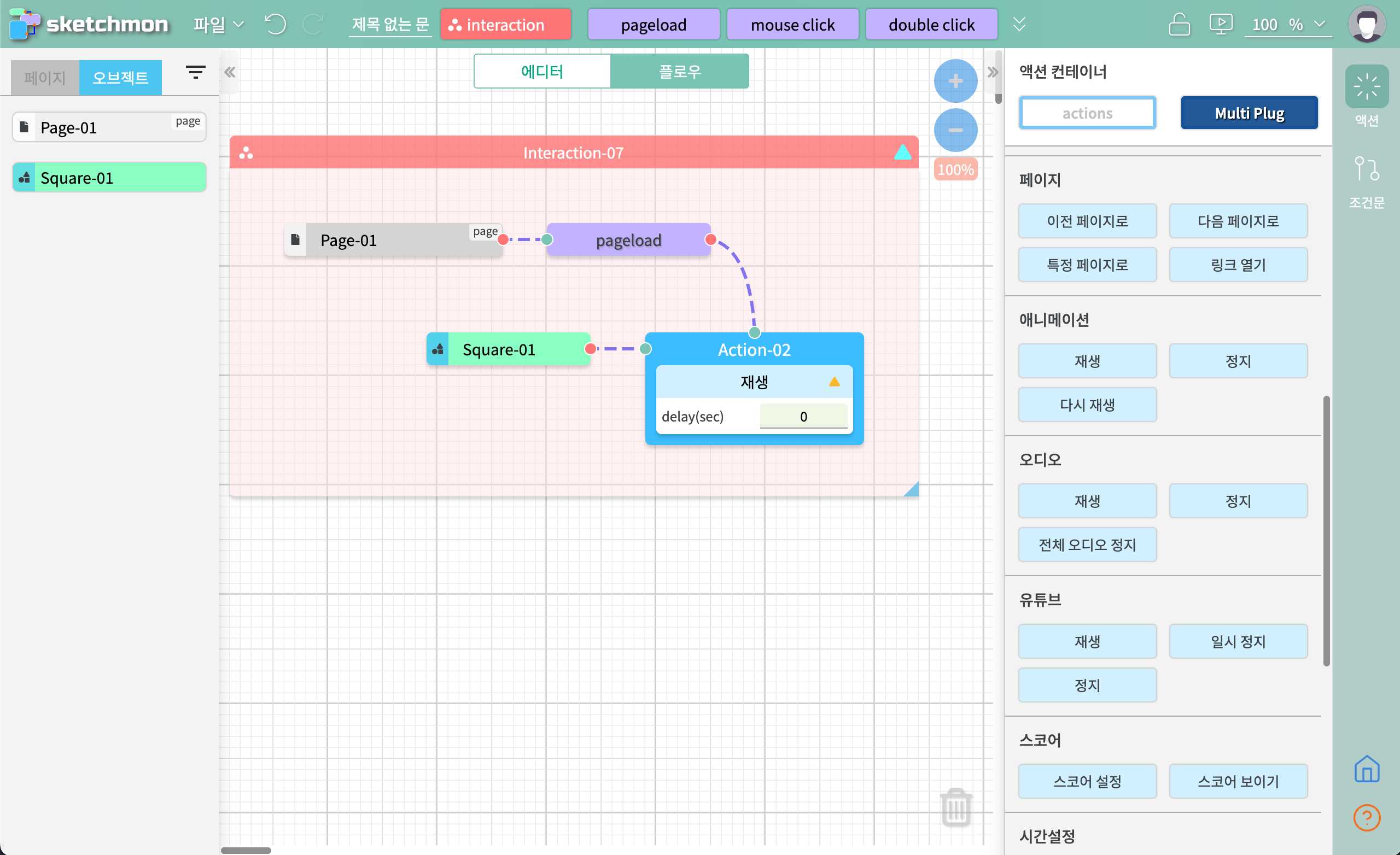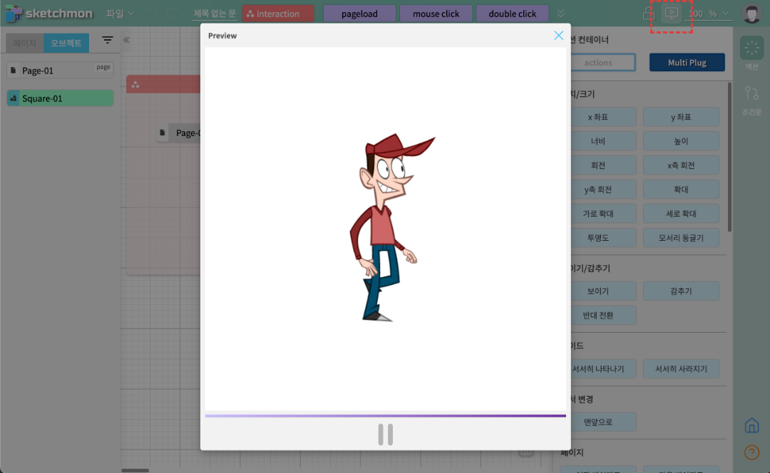 - 플로우 내용 : 페이지가 로드되면 위에서 만든 스프라이트 애니메이션을 재생한다. (위에서 스프라이트 애니를 만든 사각박스 이름이 Square-01 이다.)