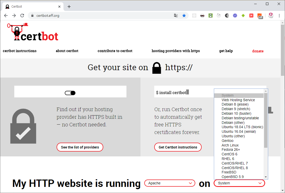 여기 예제에서는 Apache, Ubuntu 18.04 를 선택하였으므로 이를 기준으로 한다.