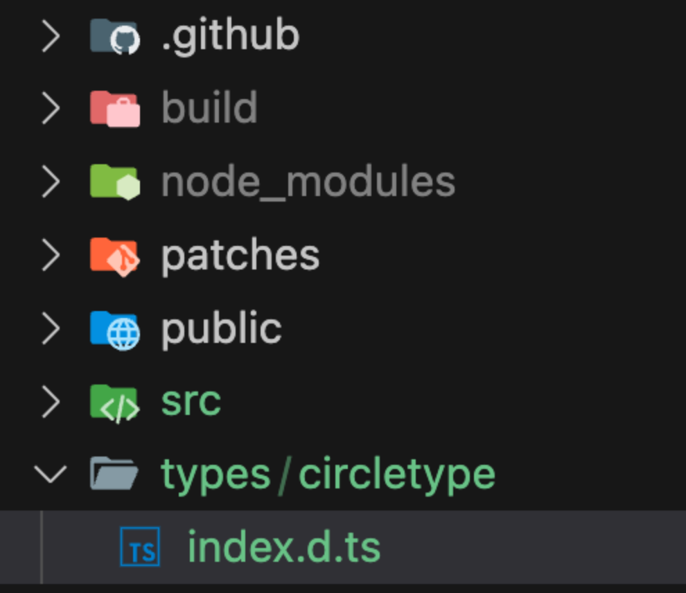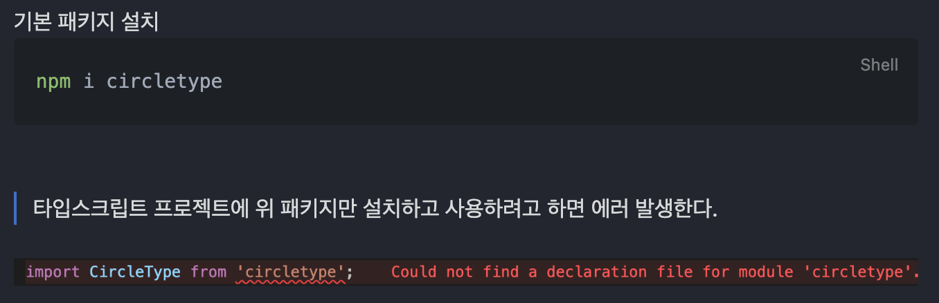 타입스크립트 프로젝트 내에 텍스트를 둥글게 만들어주는 "circletype" 라는 패키지를 사용하려는데, 이 패키지는 타입스크립트를 지원하지 않아 그냥 사용시 오류가 발생한다.