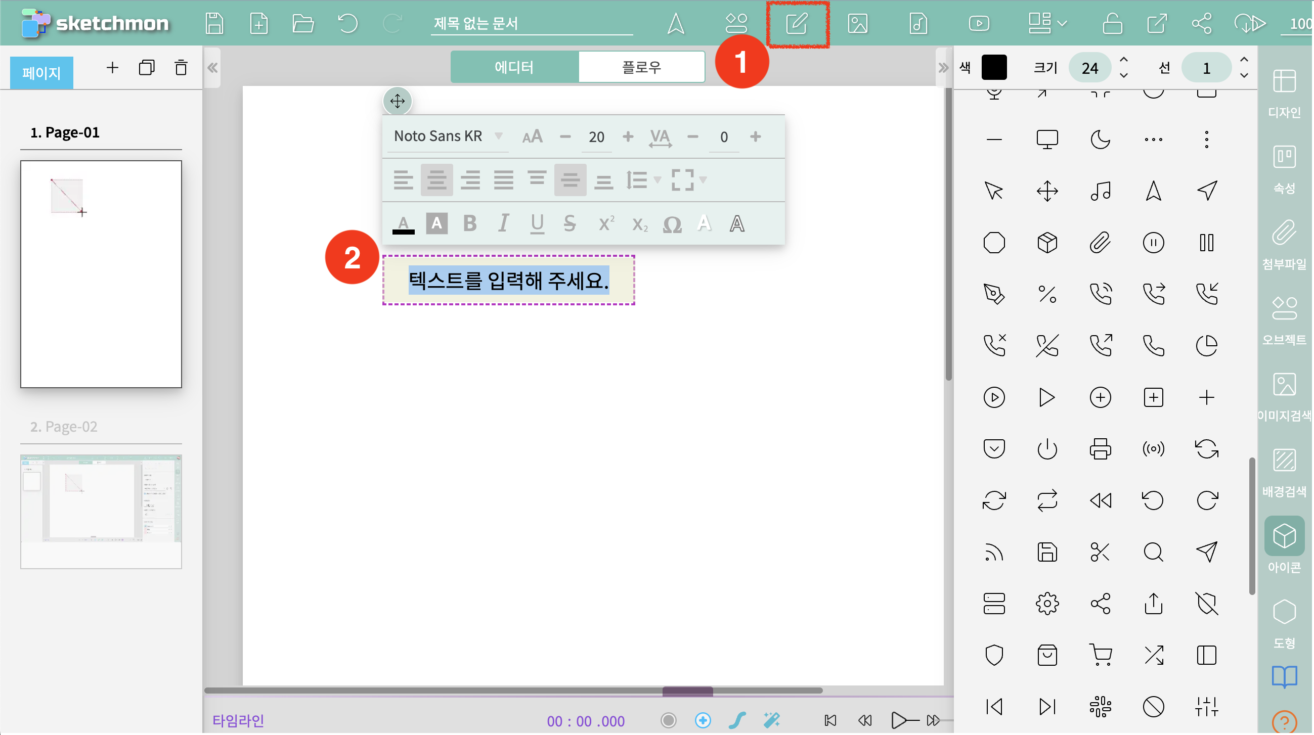 3. 글상자 그리기 : 상단 [글상자] 그리기 버튼 클릭 후 아래 캔버스 특정 위치에 마우스로 클릭한다.