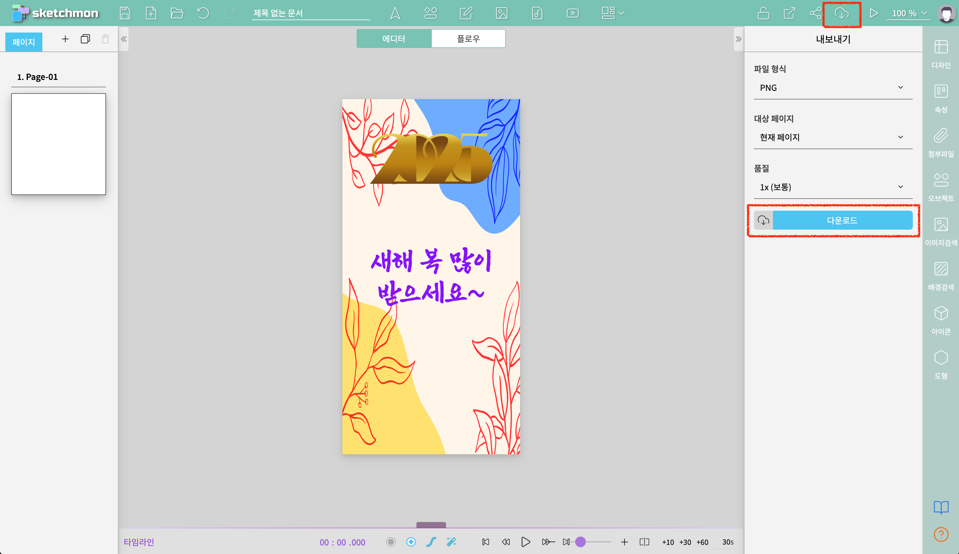 상단 [내보내기] 아이콘을 선택 후 [다운로드] 버튼을 클릭하면 이미지로 다운로드 받아진다.