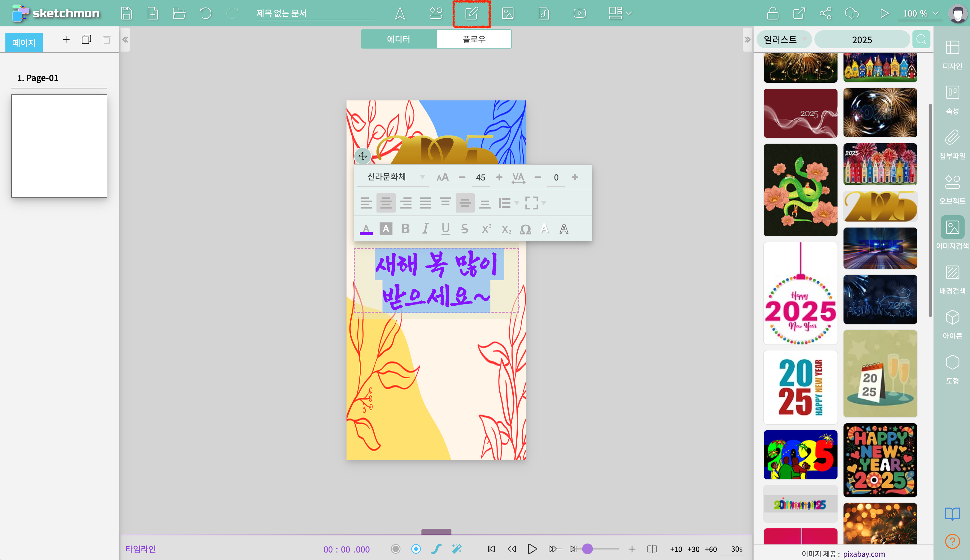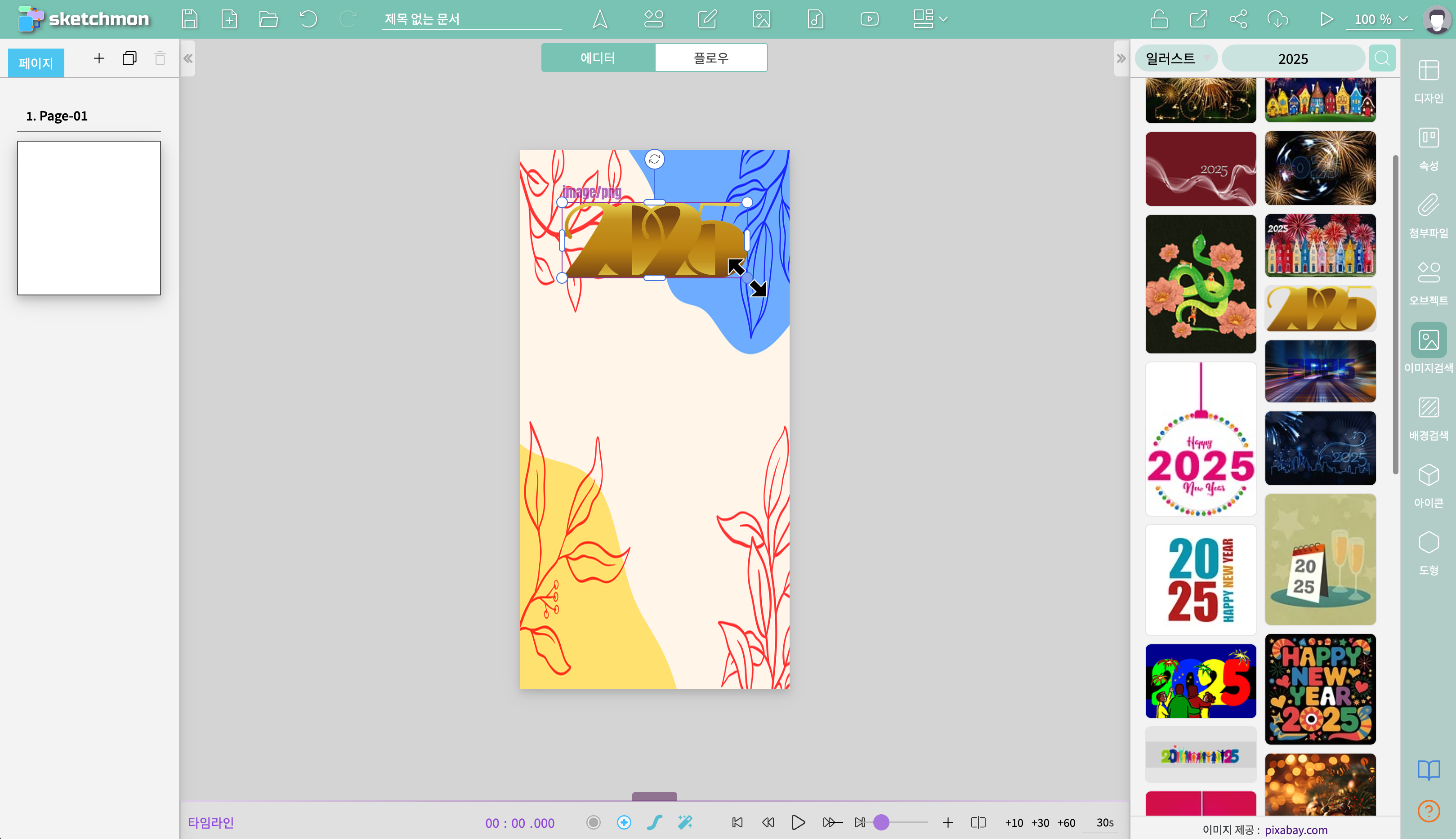 우측탭에서 [이미지 검색] 클릭하고 상단에 "2025" 라고 입력하고 검색한 뒤 마음에 드는 제목이미지를 캔버스로 드래그 한다.